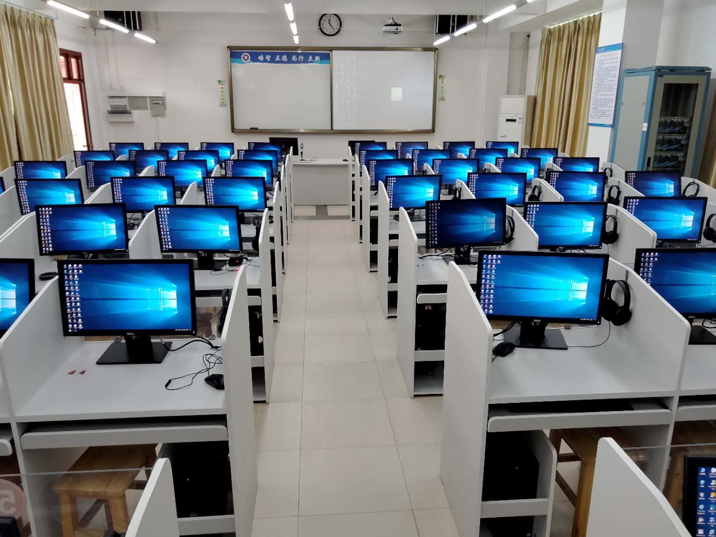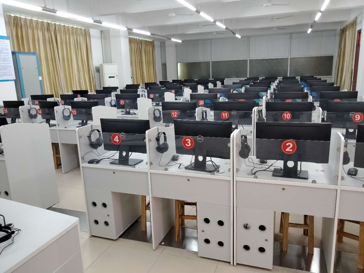 在2018年6月,信息与设备管理处根据外国语学院最新的教学环境要求,对3702和3704实验室进行彻底更新,把原实验室内的强电、弱电、计算机等全部按主流参数进行重新购买配备。更新后的实验室采用全新的短焦投影机和可推拉式的白板,可以避免投影机光线对教师眼睛的直射,也避免了教师影子被透射在屏幕上遮挡画面。在环境上加装了12套风扇清风设备,最大程度上改善了教学环境。